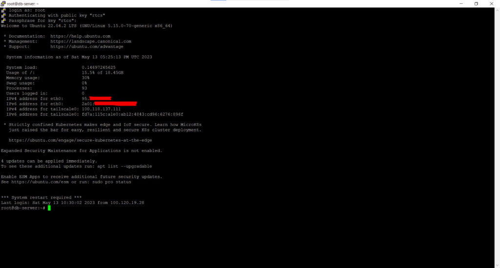 As we’ve established, our network is protected by firewalls that restrict access from the public internet to our servers. This means that even if the administrator attempts to access the servers using their public IP addresses, they would be denied access. Instead, access to the servers is only permitted through Tailscale’s secure overlay network, which ensures that all traffic is encrypted and authenticated.